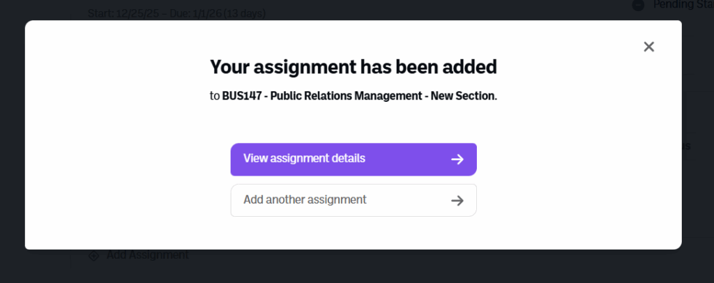 8. You will be able to view the assignment details or add another assignment for quick bulk creation