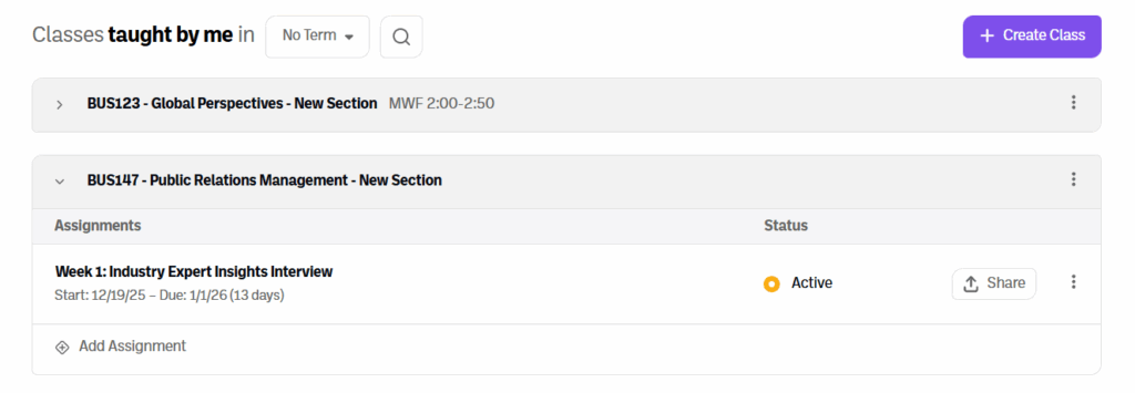 1. Under your new class, select “Add Assignment”