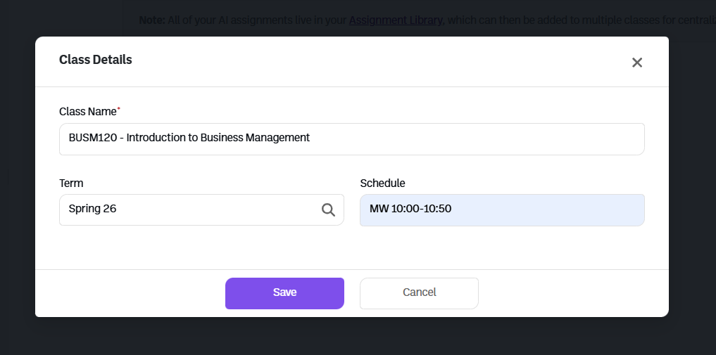 Once your assignment is created, you will be able to add the assignment to any class.