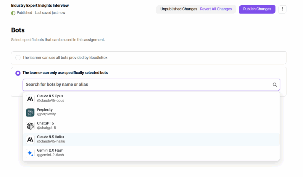 6. Under the bots tab, configure your assignment to allow students’ access to all bots and models on BoodleBox or a select number of bots (including custom bots) and models to complete the assignment